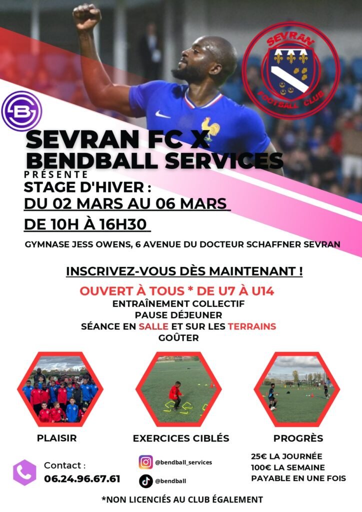 Le Sevran FC, en partenariat avec BendBall Service organise un stage de football pour les enfants âgés de 6 à 13 ans, qui se déroulera du 02 au 06 mars 2026 au stade Jesse Owens (av du Dr Schaffner).